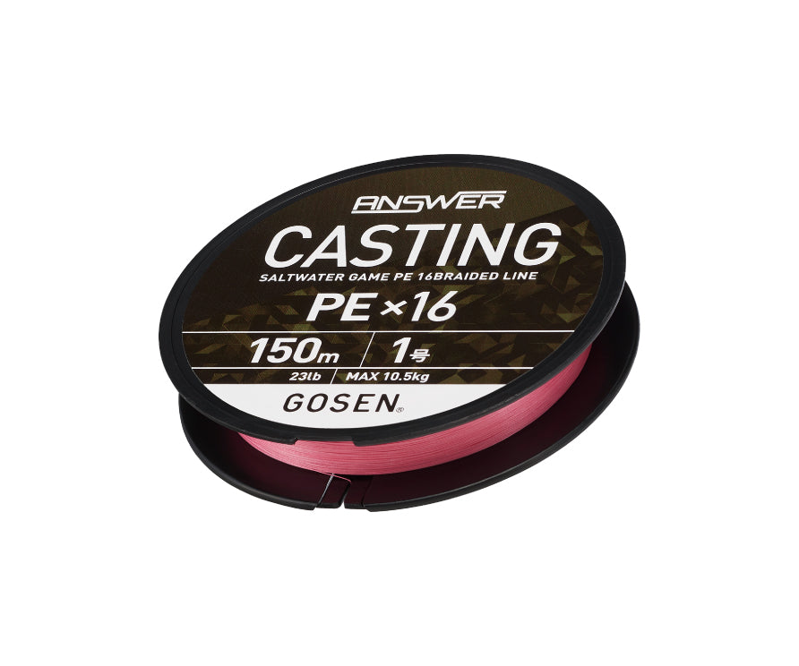 Answer Casting PE X16 е изключително фино и плътно плетено влакно от Gosen Japan, изработено по патентовани технологии с шестнайсет нишки. При шестнайсет нишковото влакно броят на стъпките в оплетката е 1.3 по-голям в сравнение при тези с 8 нишки, което допринася за по-добра стабилност на структурата, висока якост и превъзходно гладка повърхност. Уникалната "SG обработка" на GOSEN създава стегнато и плътно тялото за още по-висока чувствителност и оперативност. Гладката повърхност на оплетката с 16 влакна гарантира далечни дистанции при замятане на примамките. Цветът на влакното е розов, даващ отлична видимост, независимо дали риболовът е през деня или нощта.