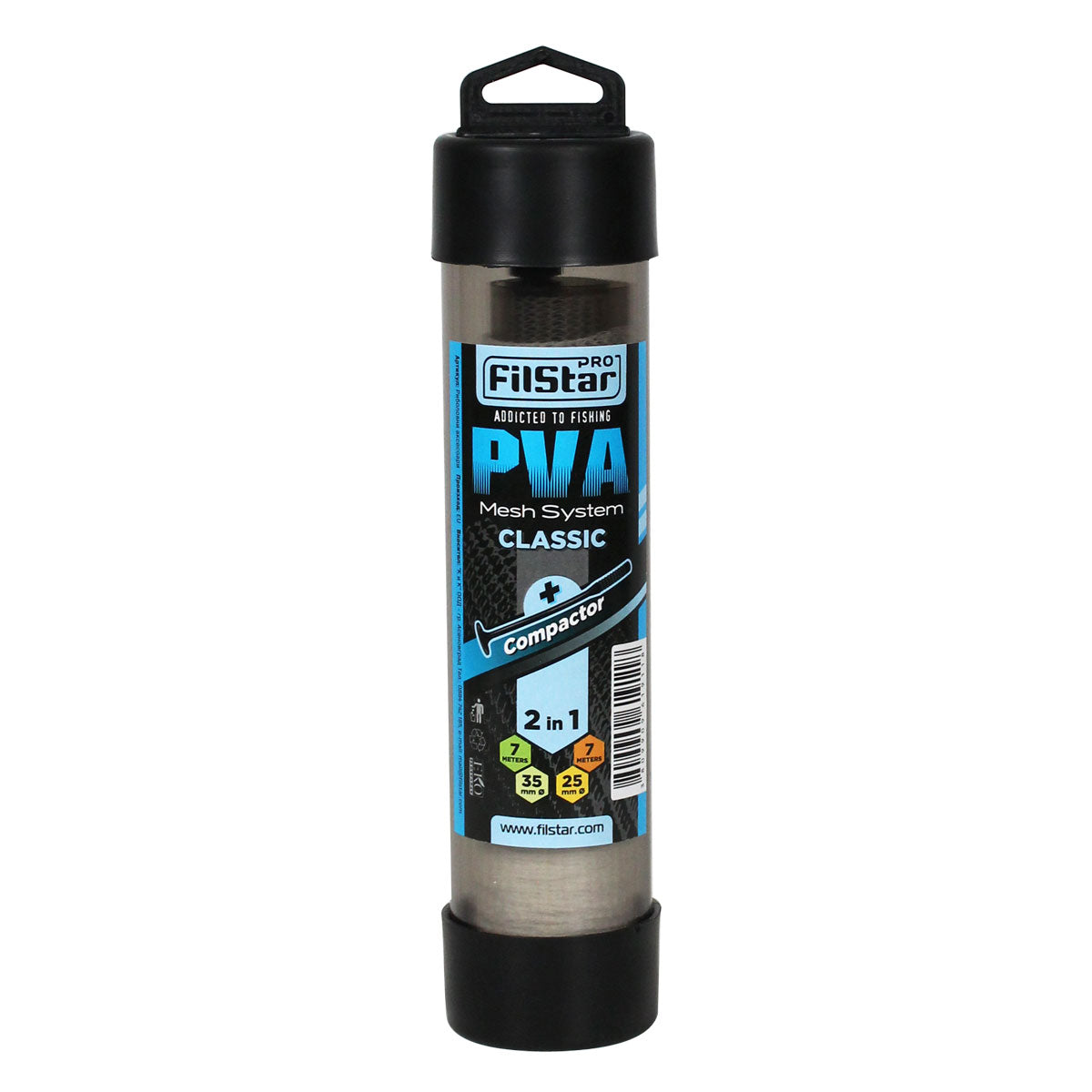 PVA комплект FilStar 2 в 1, включващ два PVA ръкава с различни диаметри, съответно 25 и 35 mm, инструмент за уплътняване и удобен тубус за съхранение. Ръкавите са с дължина 7 m и са нанизани около тръби с фуниест отвор в единия край, които улесняват зареждането на захранката. Компакторът за уплътняване на пълнежа е двустранен и пасва на двата диаметъра ръкави. Класически PVA комплект, отличен за създаване на стегнати опаковки със стръв.
